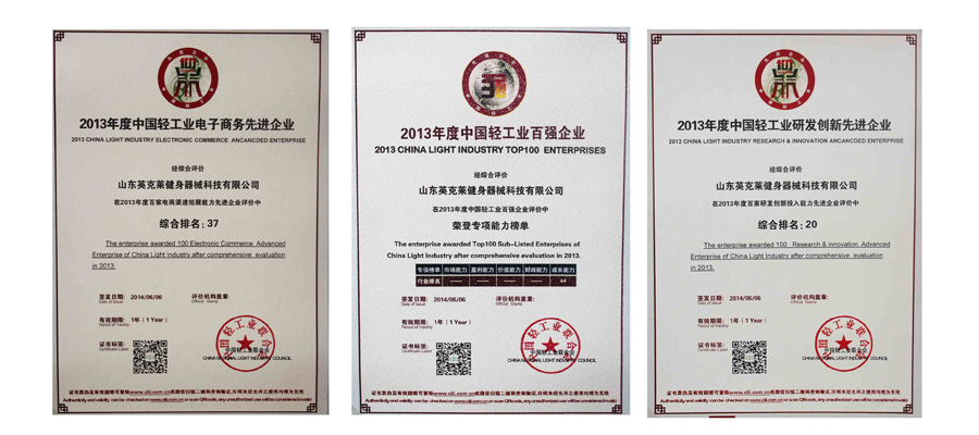 在本次会议上,山东英克莱健身器械科技有限公司共获得:2013年度中国轻工业百强企业专项能力百强企业、2013年度中国轻工业研发创新先进企业、2013年度中国轻工业电子商务先进企业三项大奖。